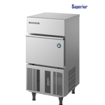 The HOSHIZAKI IM-30CNE-25 Counter Fit-In Cube Ice Maker produces up to 18 kg of clear, hygienic cube ice per 24 hours at 21°C ambient air and 15°C water temperature. It has a compact under-counter fit with a maximum storage capacity of approximately 11.5 kg of ice. The ice cubes are medium-sized, measuring about 25mm x 25mm x 23mm.